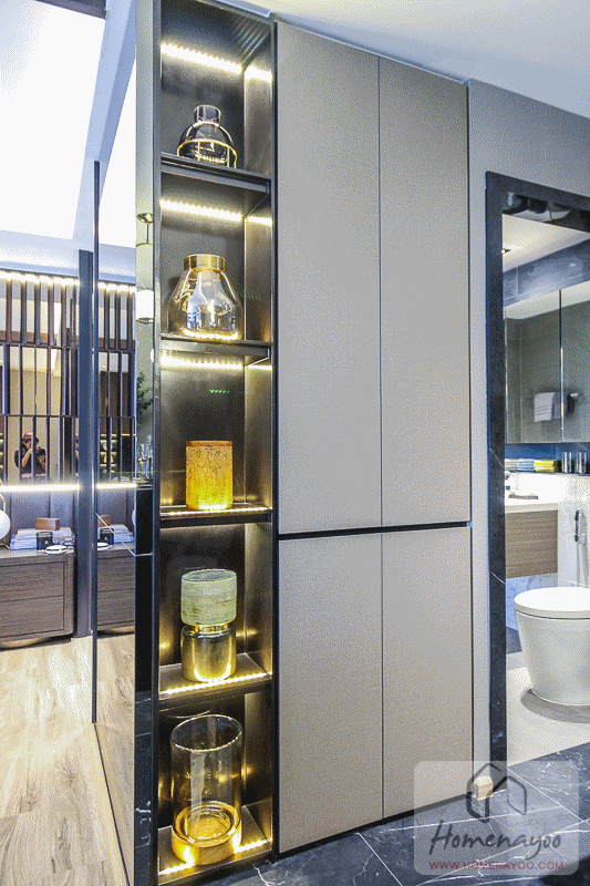 ติดกับประตูทางเข้าห้องหรือส่วน Foyer มี Built in ชั้นวางของสูงจรดเพดานแบบช่องและแบบบานปิดมาให้ ช่วยเพิ่มพื้นที่ใช้สอยในห้องได้ดี เปิดให้ดูด้านในจะเห็นว่ามีชั้นวางรองเท้าและชั้นวางของมาให้หลายชั้น