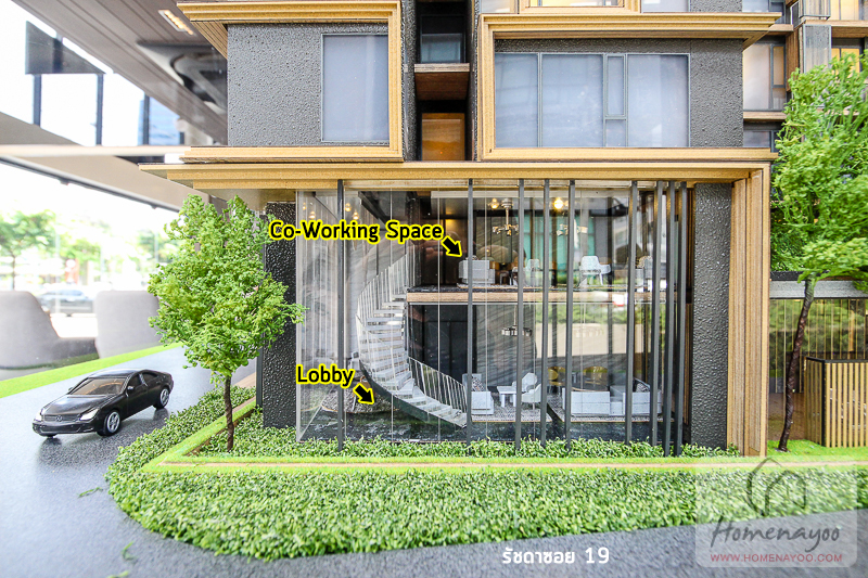 Lobby โครงการเป็น Lobby เพดานสูงตั้งอยู่ที่หัวมุมโครงการติดกับสามแยกในซอยรัชดา 19 ที่นอกจากช่วยลดความทึบของทรงอาคารลงแล้ว รอบผนังกระจกของ Lobby ยังล้อมไปด้วยสวนหย่อมของโครงการ เพิ่มบรรยากาศที่ร่มรื่นให้ภายในโครงการเองและในซอยรัชดา 19 ด้วย
