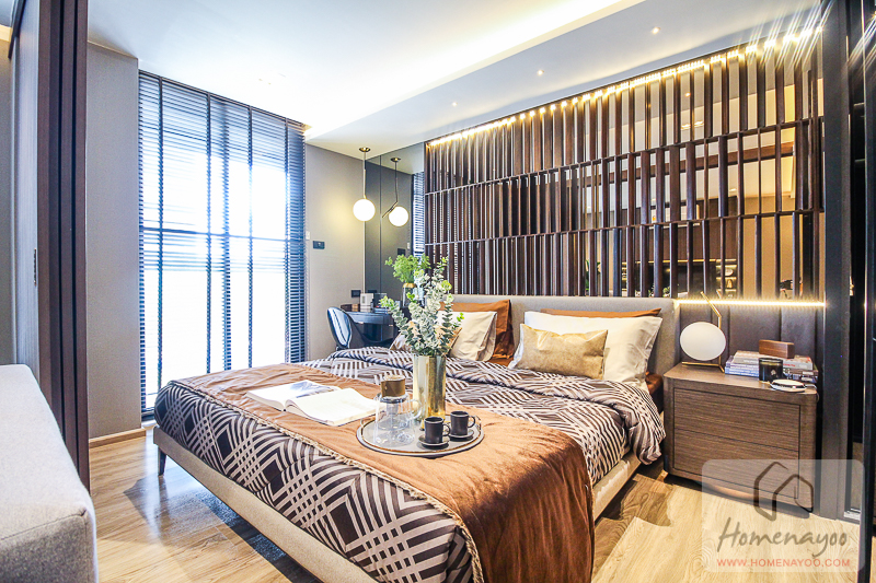 ส่วนห้องนอนมีฉากกั้นไม้มาให้มิดชิด เป็นส่วนตัว โดยมีระเบียงในตัว และภายในห้องมี Walk in Closet และประตูเปิดไปห้องน้ำได้ ฟังก์ชั่นโดยรวมของห้องนี้ ตอบโจทย์การอยู่อาศัยแบบครอบครัวในเมืองได้เป็นอย่างดีค่ะ
