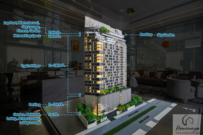 | จำนวนห้อง | 409 ยูนิต (ยูนิตพักอาศัย 406 ยูนิต + ยูนิตร้านค้า 3 ยูนิต) |