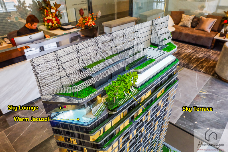 สิ่งอำนวยความสะดวก : ถือว่าจัดมาให้ครบนะ กับจำนวนยูนิตเท่านี้ ใช้งานได้พอดีๆค่ะ โดยส่วนกลางจะอยู่ที่ชั้น 1 และชั้น 28 – 29 ฟังก์ชั่นของส่วนกลางก็ค่อนข้างมาตรฐาน มี Lobby, Lap Pool, Jacuzzi, Sky Lounge, Fitness, Co – Working Space, Urban Forest แต่จุดเด่นจะอยู่ที่การออกแบบให้บรรยากาศดูอบอุ่น ร่มรื่น น่าใช้งาน มีการเล่นระดับและแบ่งโซนพื้นที่ให้เกินความเป็นส่วนตัวในการใช้งานแต่ละส่วน