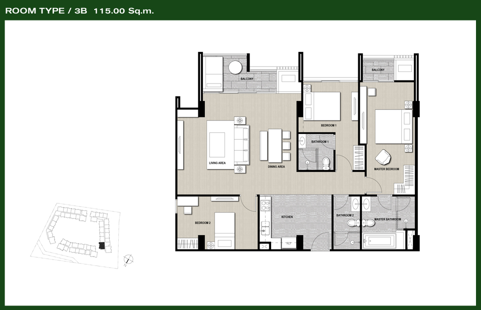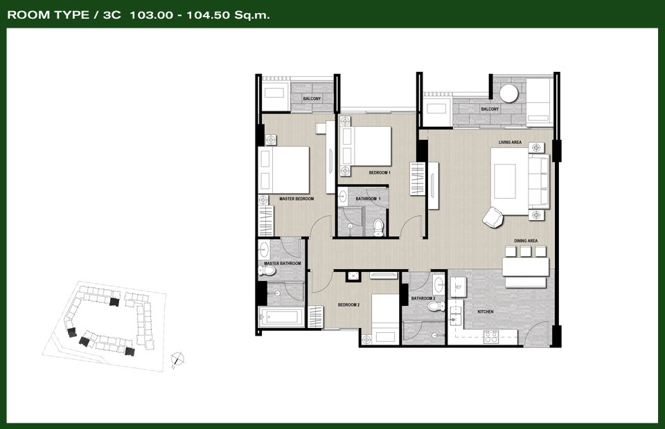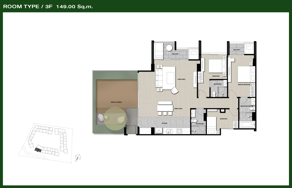 | ลักษณะห้องและขนาดห้อง | – 1 Bed / 51.50-52 ตร.ม. – 2 Bed / 74-77 ตร.ม. – 3 Bed / 103-151.50 ตร.ม. |