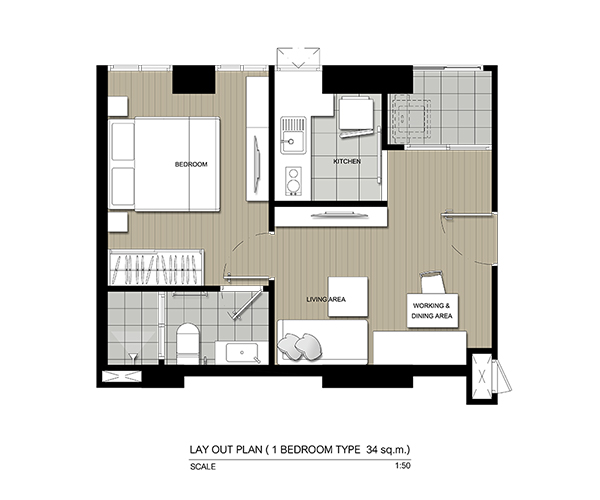 เดินเข้าห้องมาเจอส่วนห้องนั่งเล่น พื้นที่ส่วนนี้ทำมาลงตัวดีขนาดเหมาะสมกว่าห้องแรก เชื่อมกับส่วนรับประทานอาหารด้านในมีส่วนของ Bay Windows มุมนี้ด้วย ห้องน้ำและห้องครัวอยู่ฝั่งเดียวกันห้องน้ำแบ่งย่อยในห้องอีกมีประตูกระจกให้ด้านในทำให้สามารถใช้งานร่วมกันได้ คุณพ่ออาจจะใช้ห้องน้ำ ลูกก็ใช้พื้นที่ส่วนอาบน้ำไปแบบนี้ครับ ส่วนห้องครัวได้เป็นครัวปิดชุดครัววางเป็นตัว L พื้นที่ครัวอาจจะเล็กไปหน่อย จากครัวเชื่อมออกระเบียงหลังห้องได้ ส่วนห้องนอนจะอยู่อีกฝั่งทั้งสองห้อง Master Bedroom จะอยู่โซนหน้าใกล้ประตูห้อง ส่วนห้องนอนเล็กอยู่มุมด้านใน ขนาดพื้นที่สามารถวางเตียง 5 ฟุตได้สบายๆครับ
