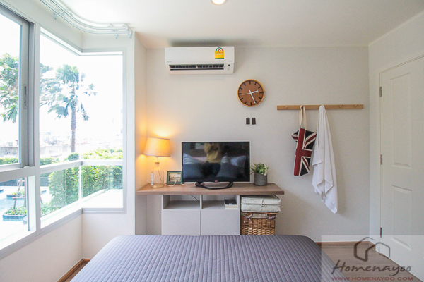 ระยะดูทีวีปลายเตียงประมาณ 2.5 ม. วางตู้เสื้อผ้าไว้ ขวามือเป็นชั้นวางทีวี ติดแอร์ปลายเตียง 1 ตัว