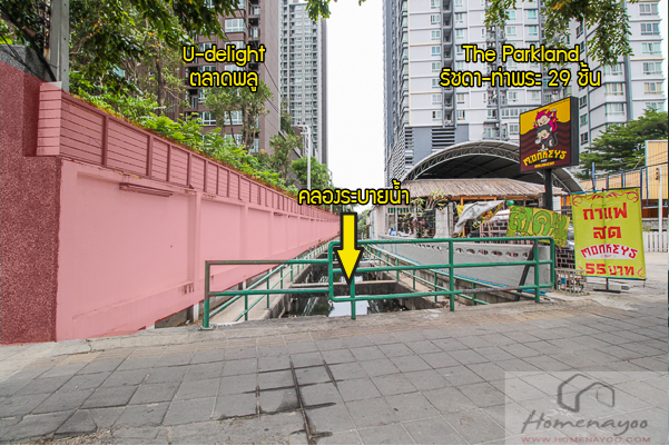 ติดกับรั้วโครงการเป็นคลองระบายน้ำยาวไปจนถึงด้านหลังโครงการฝั่งซอยเทอดไท 33 ขวามือเป็นร้านกาแฟสด ด้านในเป็นโครงการ The Parkland รัชดา-ท่าพระสูง 29 ชั้น