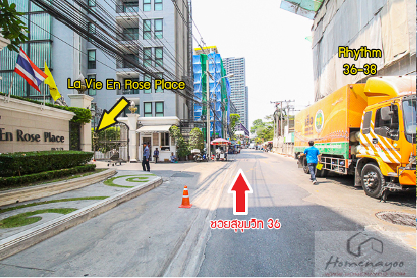 จากนั้นซ้ายมือจะเป็นโครงการ La vie En Rose Place ขวามือเป็น Rhythm 36-38
