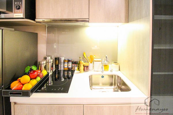 พื้นที่เตรียมอาหารค่อนข้างจำกัดหน่อย หาแผ่นไม้มาปิด Sink ล้างจานเพื่อเพิ่มพื้นที่วางของเพิ่มได้ ผนังด้านในกรุกระจกกันเปื้อนทำความสะอาดได้ง่ายหน่อย ได้เตาไฟฟ้าหน้าเซรามิก 2 หัววางแรวตั้งพร้อมเครื่องดูดควันของ Teka
