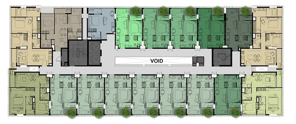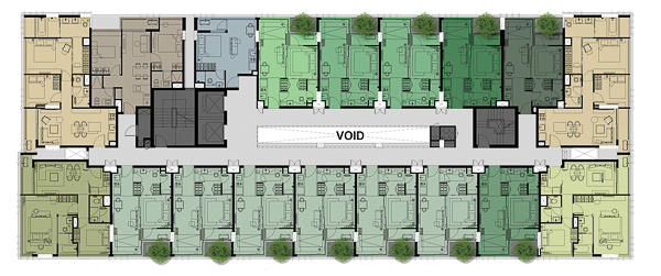 แปลนชั้น 2 ยูนิตพักอาศัยเพิ่มเป็น 17 ยูนิต เพิ่ม 2 ห้องนอนด้านหน้ามาอีก 2 ห้อง และ 1 ห้องนอน 2 ห้อง ตรงกลางระหว่างทางเดินจะเป็น Void มองลงไปเห็นบ่อน้ำชั้น 1 และเป็นช่องที่แสงส่องลงมาจากดาดฟ้า มุมซ้ายล่างที่เห็นเป็น Void คือส่วนของ Lobby ที่เป็นแบบ Double volume