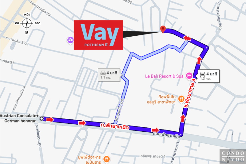ถนนพัทยาเหนือ ⇒ ซอยพัทยาสาย 3 ⇒ เลี้ยวซ้าย ⇒ ถึงโครงการ VAY โพธิสาร 2