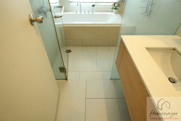 ห้องน้ำปูพื้นกระเบื้องเซรามิกผสมทราย แยกส่วนแห้ง ส่วนเปียกไว้ให้เรียบร้อย