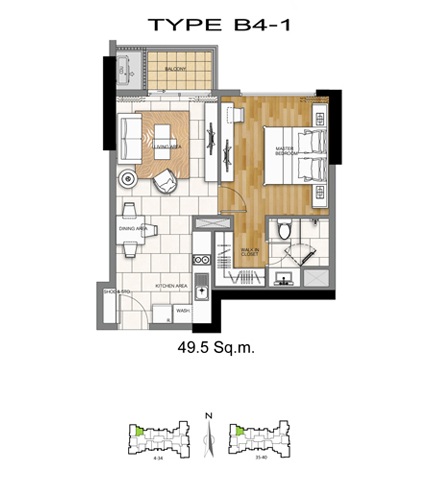 แบบห้อง 1 Bedroom ขนาด 49 – 59 ตร.ม. :