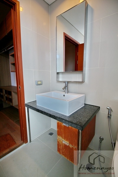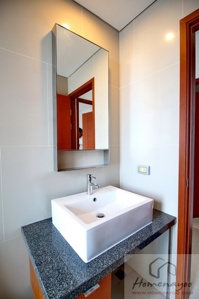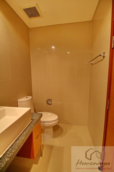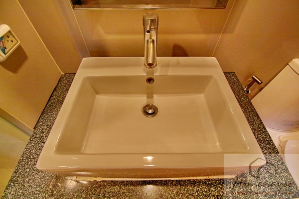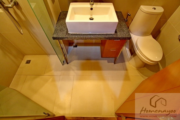 ห้องน้ำปูด้วยกระเบื้องเซรามิค 60×60 ซม. ส่วนผนังกรุด้วยกระเบื้องแกรนิตโต้ ด้วยตำแหน่งของห้องน้ำที่อยู่ตำแหน่งด้านนอกมีหน้าต่างรับแสงรวมถึงสามารถเปิดปิดระบายอากาศได้