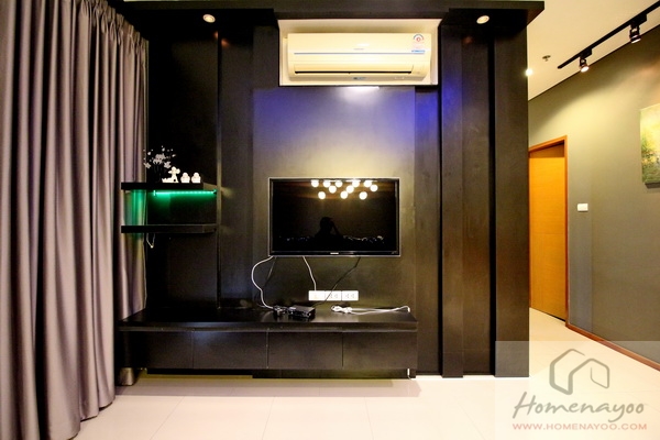 แผ่นผนังทางด้านนี้ปกติแล้วจะเป็นผนังสีขาวฉาบเรียบ ใช้ติดตั้งทีวีแบบแขวน หรืออาจจะวางไซด์บอร์ดหรือจะบิวท์อินเป็นชั้นวางทีวีเต็มผนังเลยก็ได้ เพราะพื้นที่มีเหลือเฝือ