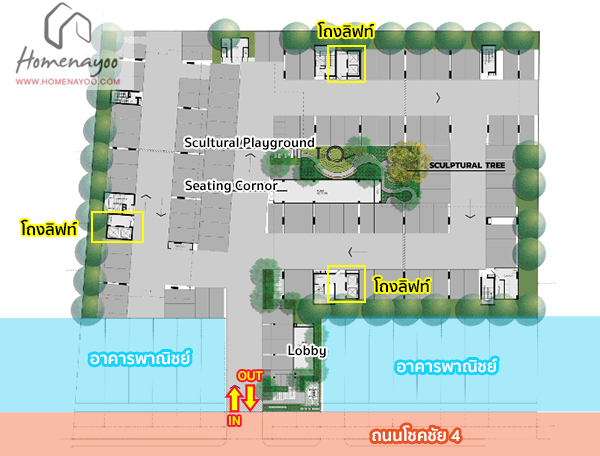 ทางเข้า-ออก ของโครงการจะมีแค่ทางเดียวคือจากถนนโชคชัย 4 เมื่อเข้ามาในโครงการจะเจอกับป้อมรปภ. เป็นจุดแรก ถัดมาเป็น Lobby รับรองทางขวามือ โดยอาคาร Lobby จะเป็นอาคารสูง 3 ชั้น เป็น Duplex Lobby Lounge และ Library ค่ะ ถนนภายในโครงการจะเป็นแบบ one way พื้นที่ของชั้น 1 เกือบทั้งหมดจะเป็นที่จอดรถใต้อาคาร โดยจะสามารถจอดรถได้ทั้งหมดประมาณ 43% นอกจากนั้นก็จะมีพื้นที่สวน Scultural Playground และมีพื้นที่นั่งพักผ่อน Seating Cornor แบบ indoor ที่สามารถเข้ามานั่งชมวิวสวนได้ค่ะ
